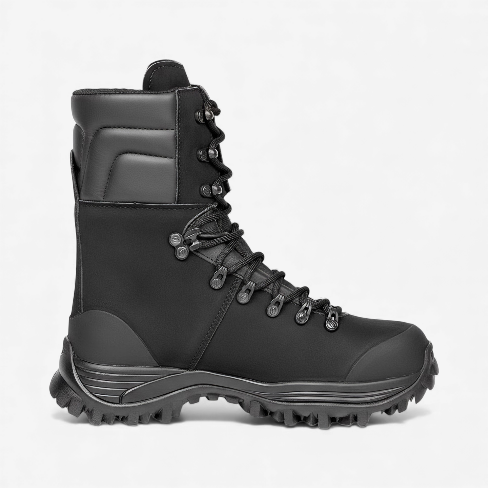 O calçado apresenta um cabedal de couro integral com tratamento hidrofugado de alta qualidade, garantindo impermeábilidade à penetração de água. Complementando essa característica, uma manta de isolamento térmico é integrada para manter os pés confortáveis em diversas condições climáticas. As áreas de articulação e conforto são cuidadosamente confeccionadas em cordura e couro vestuário, proporcionando uma experiência de uso ergonômica e confortável. Além disso, a proteção de borracha em toda a extremidade oferece durabilidade e resistência adicionais.