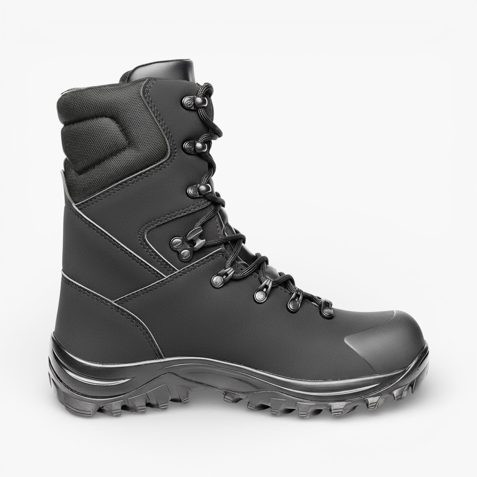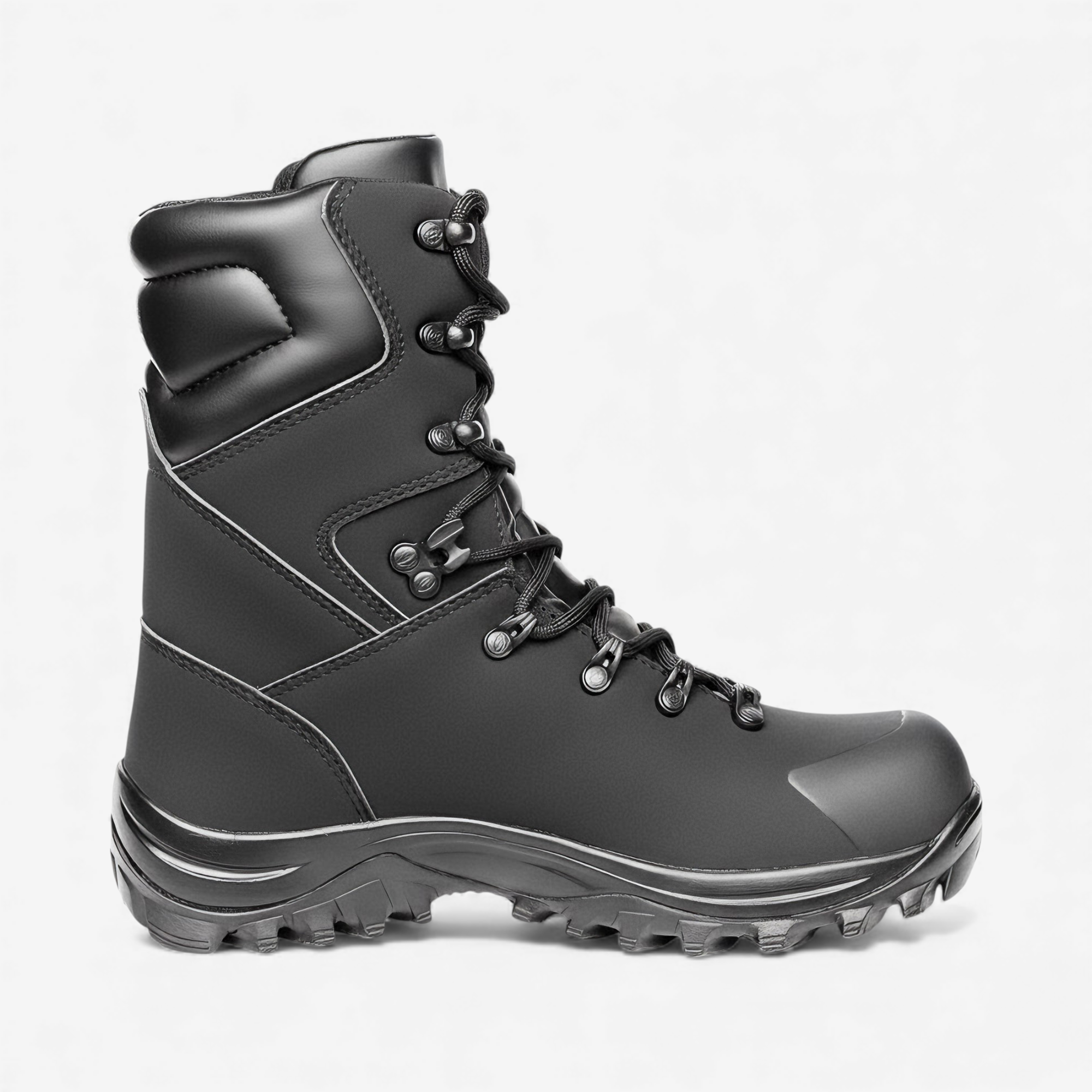 Bota tática clássica e robusta com solado tratorado, indicada para patrulhamento, policiamento ostensivo, carceragem e uniformização.