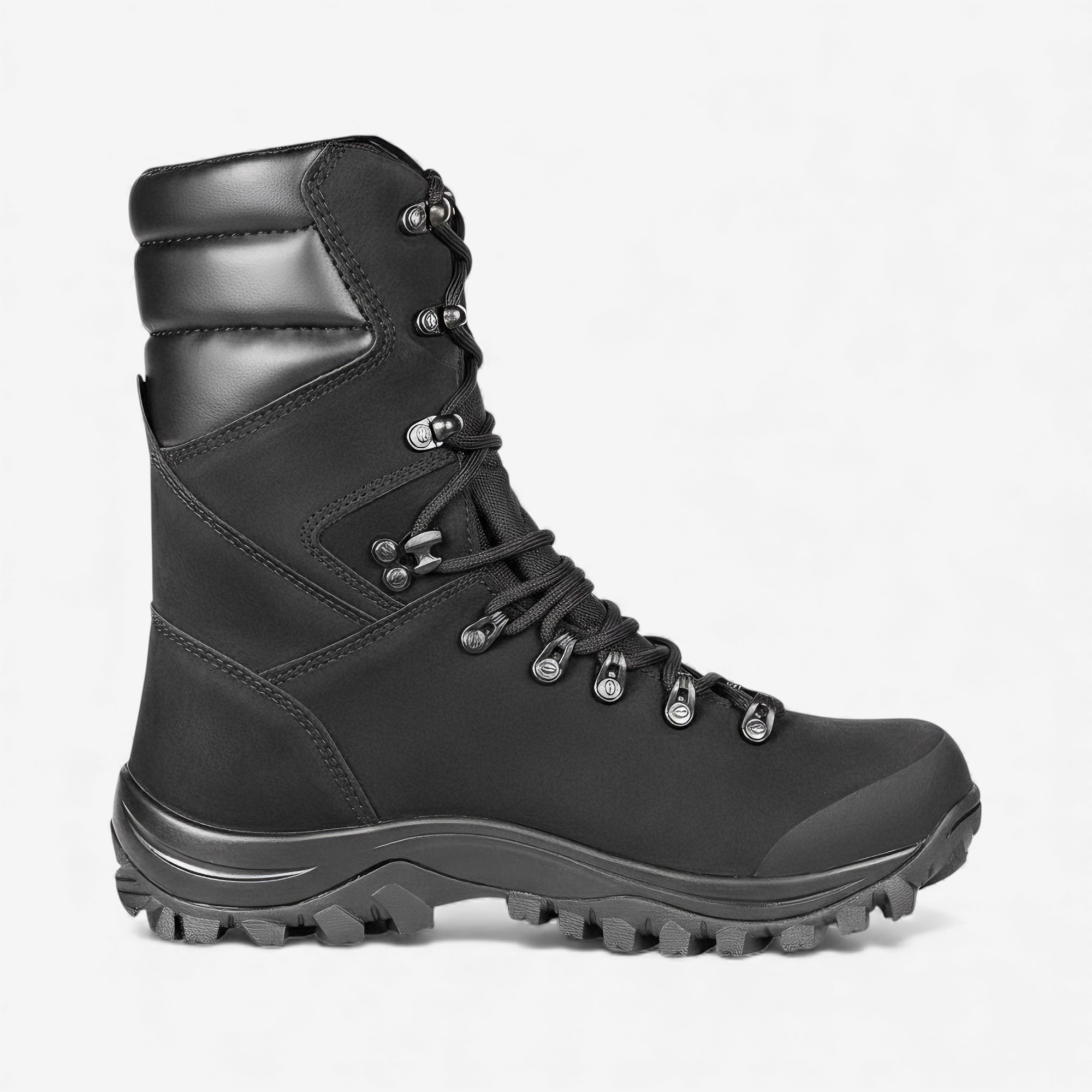 Bota tática clássica e robusta com solado tratorado, indicada para patrulhamento, policiamento ostensivo, carceragem e uniformização.