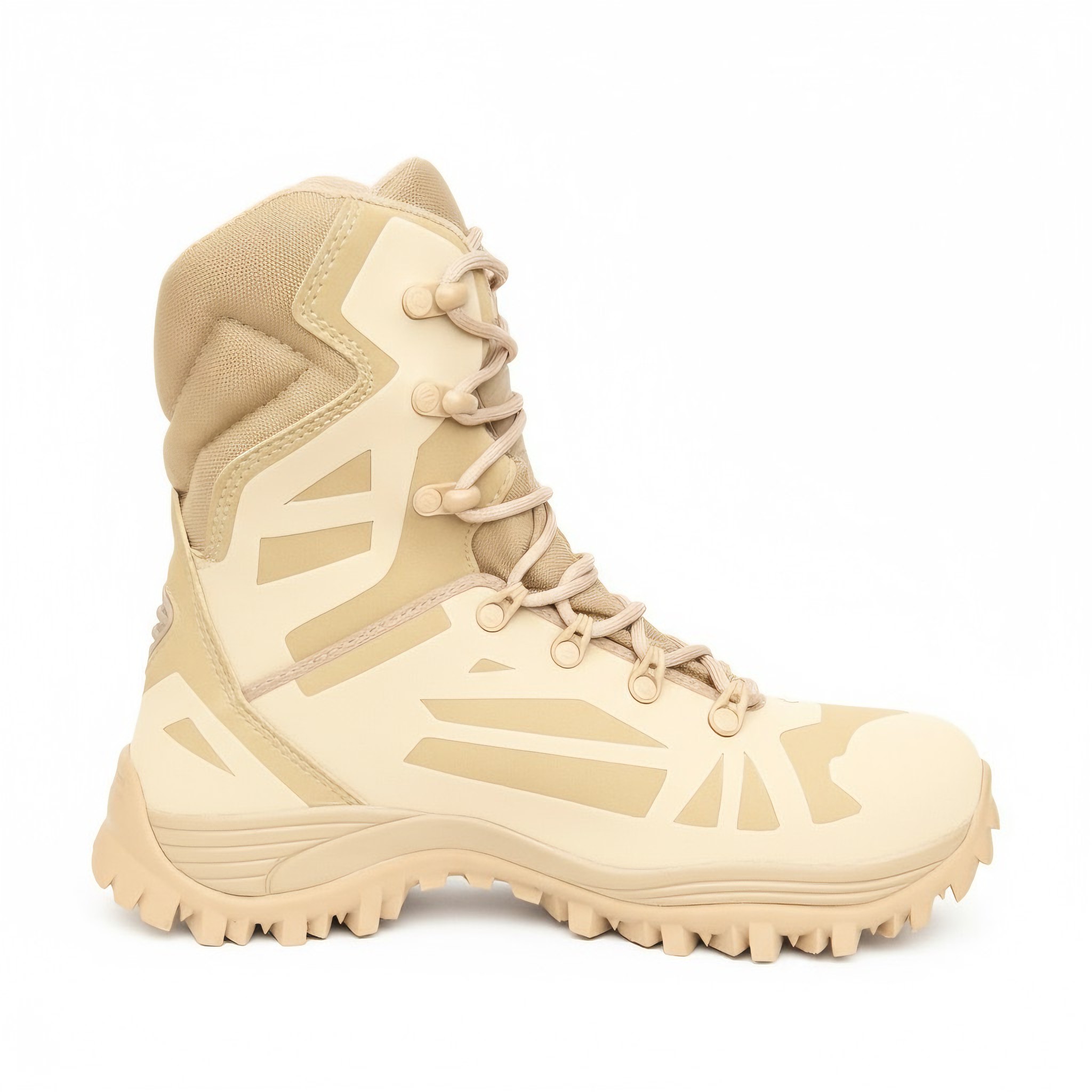 O calçado apresenta uma estética inovadora para uma bota militar, com estrutura desenvolvida em material de alta tecnologia com aplicação de NANOFILM, resultando em um cabedal extremamente resistente, leve e confortável. A construção SEAMLESS (sem costuras) na maior parte da estrutura proporciona um ajuste preciso, minimizando pontos de atrito. O cano é confeccionado em Cordura acolchoada, oferecendo maior conforto e flexibilidade. Passadores em polímero de alta resistência são firmemente fixados ao cabedal, assegurando amarração estável. O cadarço com “alma dupla” possui reforço interno que aumenta a durabilidade do conjunto.