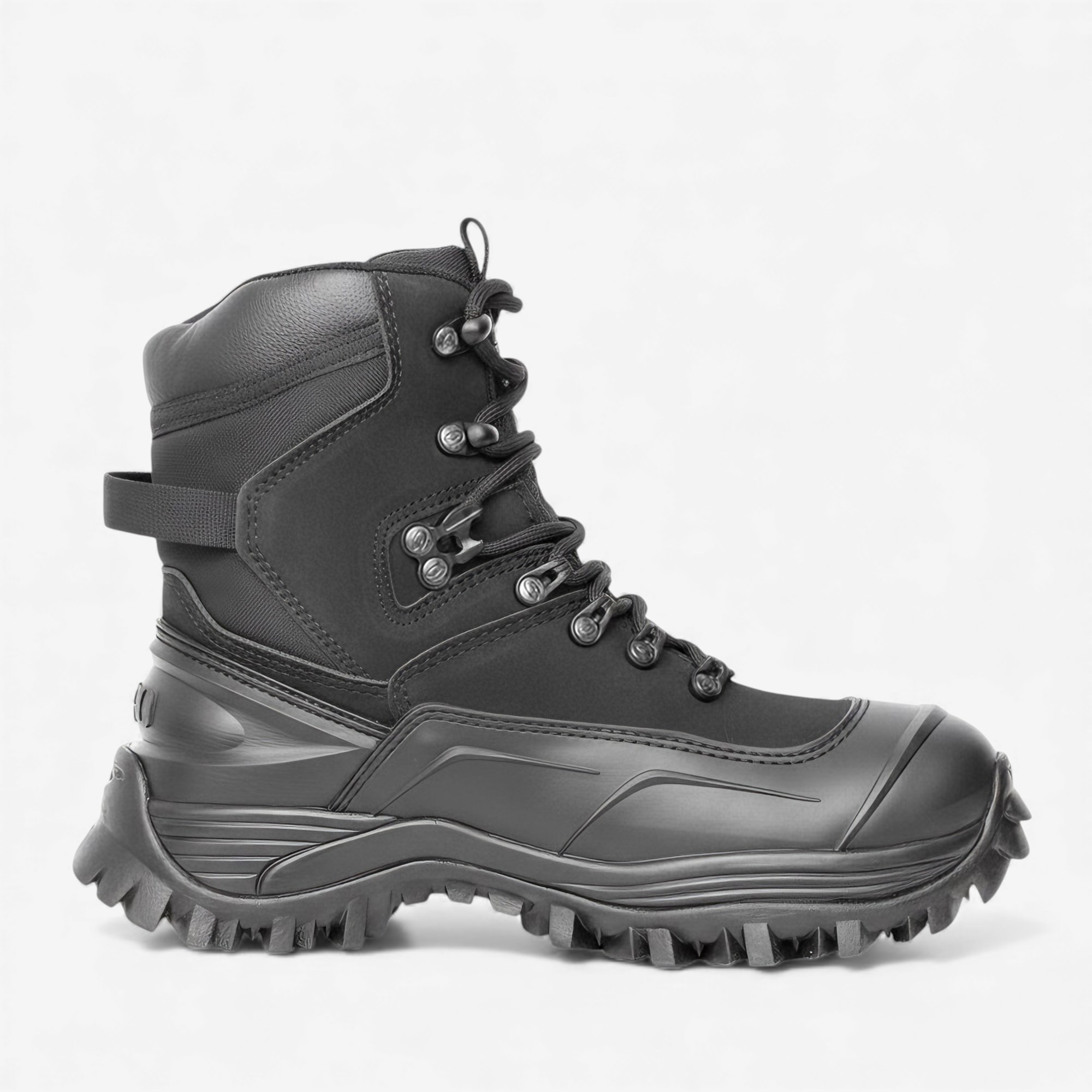 Solado de alta resistência com padrão agressivo de tração, construído para absorção de impactos e estabilidade em superfícies irregulares. Projetado para durabilidade e segurança operacional.